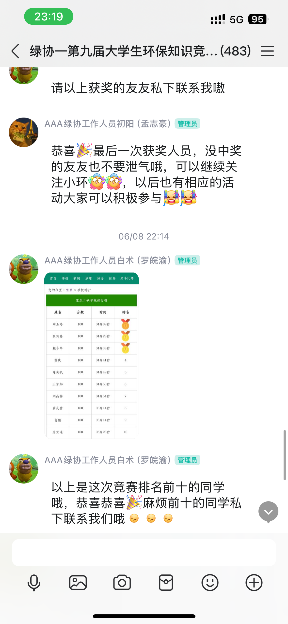 在为期15天的活动中,绿色环保协会的工作人员积极为同学们答疑解惑,同学们热情高涨,踊跃登录大赛官网参与答题。竞赛题目涵盖垃圾分类、低碳生活等多方面环保知识,兼具知识性与实用性。为鼓励同学们积极参与答题,活动期间还组织了抽奖环节,并发放了精美礼品。最终,综合排名前十名的同学获得了奖状和礼品。