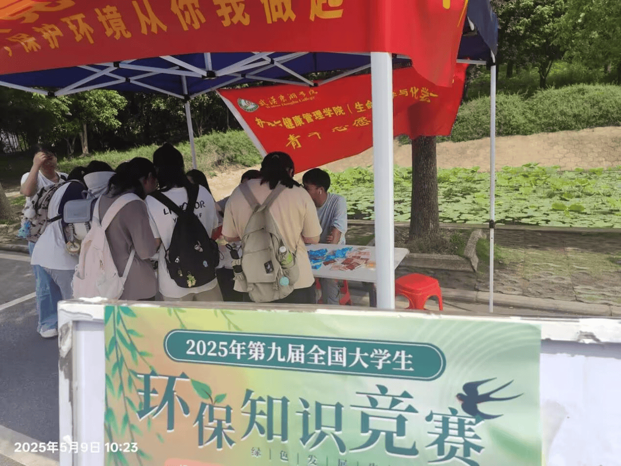 当前,全球面临气候变化、生物多样性丧失、环境污染等严峻挑战,我国正 深入推进生态文明建设,积极践行“绿水青山就是金山银山”理念,推动绿色低 碳发展。此时环保意识的普及与提升便成为了成为社会发展的重要需求。为增强我校学子们的环保意识,倡导绿色生活方式,护理与健康管理学院青年志愿者协会于5月8日在一食堂主干道开展了以"绿动九载,智汇环保"为主题的环保知识竞赛活动。知识竞赛作为传播环 保理念的有效载体,可通过趣味化、互动化的形式,将生态保护、垃圾分类、节 能减排等专业知识转化为公众易于接受的内容,激发大众对环保议题的关注。本次活动便通过互动体验、知识讲解和知识竞答等形式,向同学们普及环保知识,呼吁更多人加入环保行动。