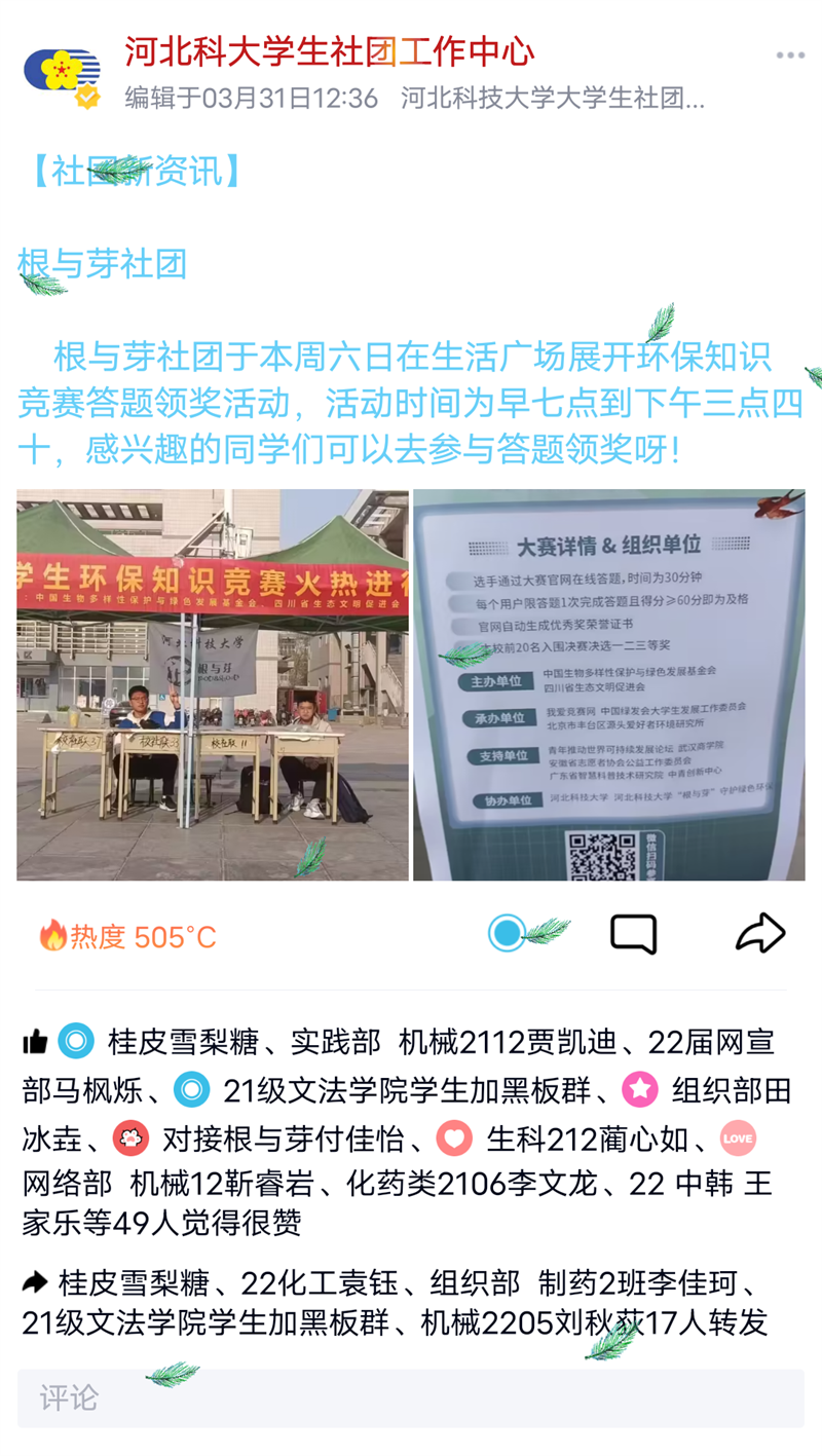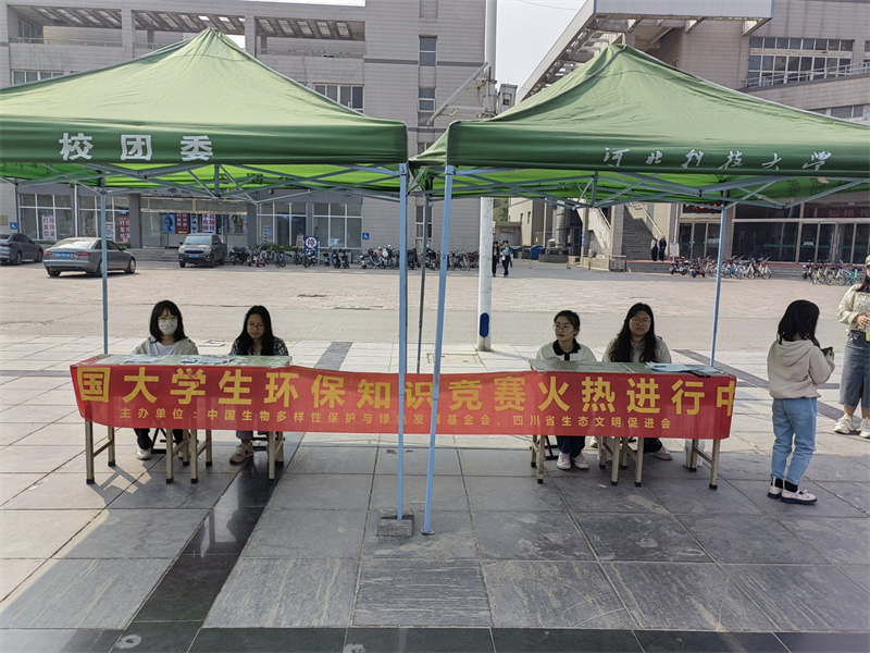 为贯彻落实习近平总书记在二十大报告提出推动绿色发展、促进人与自然和谐共生,牢固树立和践行绿水青山就是金山银山的理念,站在人与自然和谐共生的高度谋划发展,提升大学生环保意识,展现当代青年的环保担当与青春风采,影响和带动更多的人参与到环保事业中来,壮大中国环保工作力量。在2023年第54个"世界地球日"(4月22日)和第52个"世界环境日"(6月5日)来临之际,中国生物多样性保护与绿色发展基金会、四川省生态文明促进会、我爱竞赛网共同成立第七届大学生环保知识竞赛组委会,举办2023年第七届大学生环保知识竞赛。河北科技大学“根与芽”守护绿色环保协会作为全国大学生环保知识竞赛的协办单位之一,通过线上+线下宣传参与竞赛答题的方式,丰富了同学们在环保方面的知识储备,在答题的同时获得属于自己的小奖品,有力地推动了环保理念的普及与深化。河北科技大学“根与芽”守护绿色环保协会也将继续践行绿色发展理念,营造浓厚的环境保护文化氛围,为提高大学生的环保意识,保护美化生态环境做出应有的贡献。